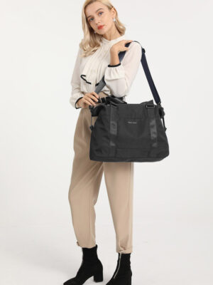 El bolso es de material oxford impermeable y es perfecto para tus viajes cortos, su diseño flexible y liviano te permite transportarla con facilidad, llévalo con las asas de hombro o el tirante largo removible, pieza adaptable a bastón de maleta en la parte posterior.