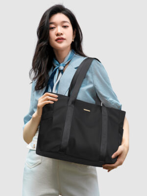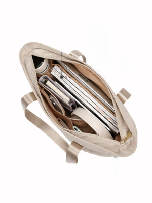 Nuestra Tote Atenea es de material oxford impermeable y cuenta con un amplio compartimento principal que incluye un bolsillo acolchado para laptop hasta 14″