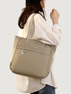 Nuestra Tote Alice es de material oxford impermeable y cuenta con un amplio compartimento principal que incluye un bolsillo con cierre y doble organizador abierto.